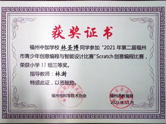 学生参加福州市青少年创意编程比赛多人荣获一二三等奖。