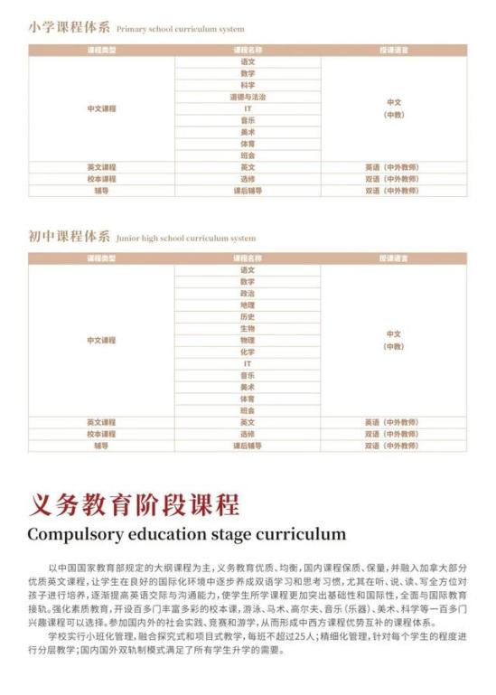 课程体系以中国国家教育部规定的大纲课程为主,国内课程保质、保量,并融入加拿大部分优质英文课程,义务教育优质、均衡。同时我校秉承“多一个平台,多一批人才”的办学理念,注重强化素质教育,开设了百多门丰富多彩的校本课,学生还有机会参加国内外的社会实践、竞赛和游学,从而形成中西方课程优势互补的课程体系。