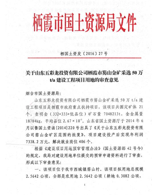 2016年2月23日,栖霞市政府披露的文件显示,笏山金矿项目是栖霞市政府重点扶持项目,项目共圈定矿体21个,查明金(332 333 低品位)矿石量7048213t,金金属量18784kg,山东省国土资源厅于2014年6月出具了《关于山东五彩龙投资有限公司笏山金矿区范围的批复》,项目建设投产后实现年利润7338.2万元,解决就业岗位406个。