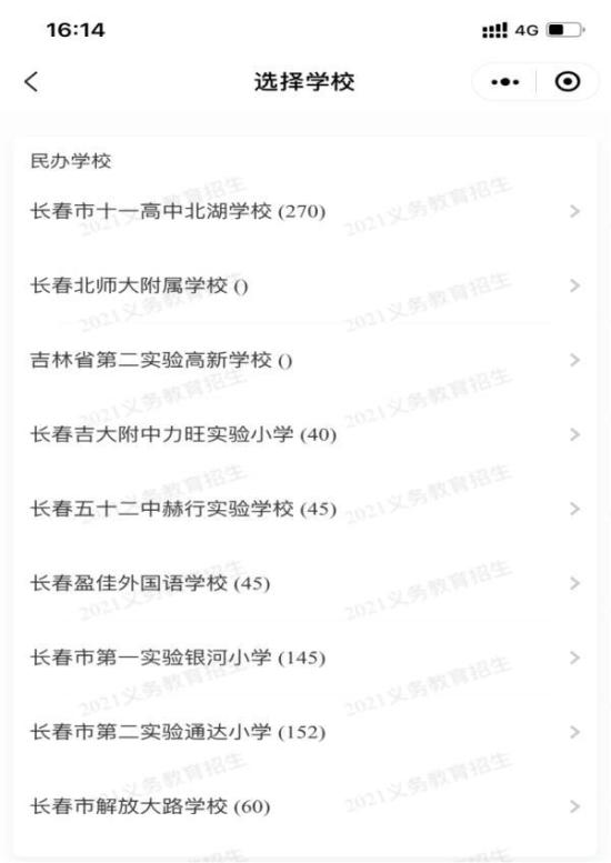 (1)在报名页面中,选择一所民办学校(学校列表中有对应的派位人数)