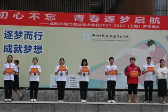 国学朗诵是德育良好载体,在中共成都市锦江区教育局组织的“同行向党”诗歌朗诵比赛中,成都市现代职校师生的原创诗歌《同行敬党》荣获特等奖,本次开学典礼,学校党委副书记李虹、党委宣传委员李青为获得该奖的李乐、庞俊杰等九名同学颁奖。