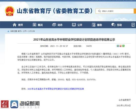 11月29 日,根据《山东省教育厅 山东省财政厅关于实施山东省高水平中等职业学校建设计划的通知》(鲁教职函〔2021〕33号)要求,经各市教育(教体)局推荐,山东省教育厅组织资格审查、专家评审,拟确定济南市工业学校等70所学校为2021年山东省高水平中等职业学校建设计划立项建设单位,其中,泰安市岱岳区职业中等专业学校榜上有名。
