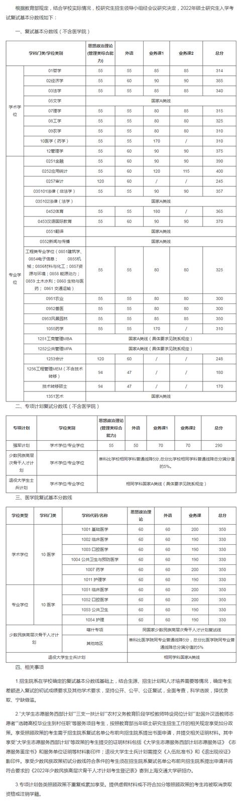 1.上表为我校基本复试分数要求,生源充裕学院可根据整体考试情况、招生计划、学科专业特点等,上调分数要求,但差额复试比例一般不得低于120%。报考该类学院的考生须达到学院公布的复试分数要求才能参加复试。