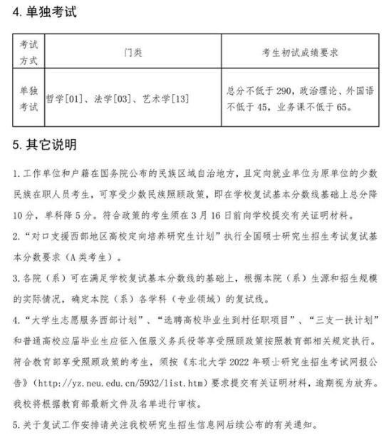 东北大学2022年硕士研究生招生考试考生进入复试的初试成绩基本要求