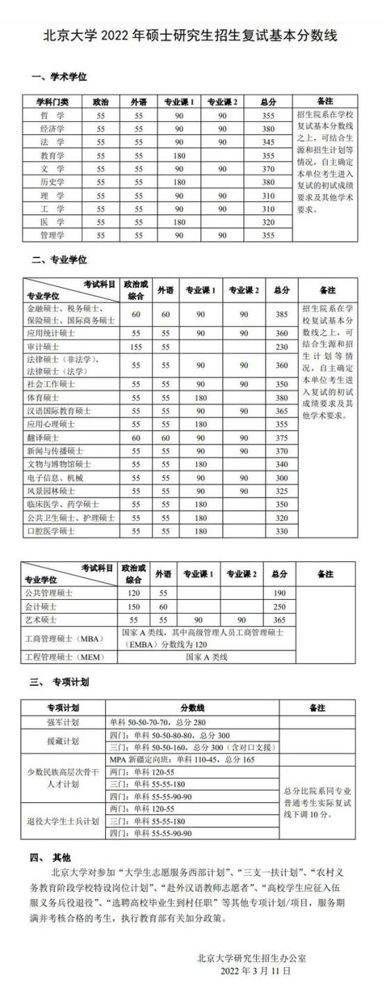 北京大学2022年硕士研究生招生复试基本分数线