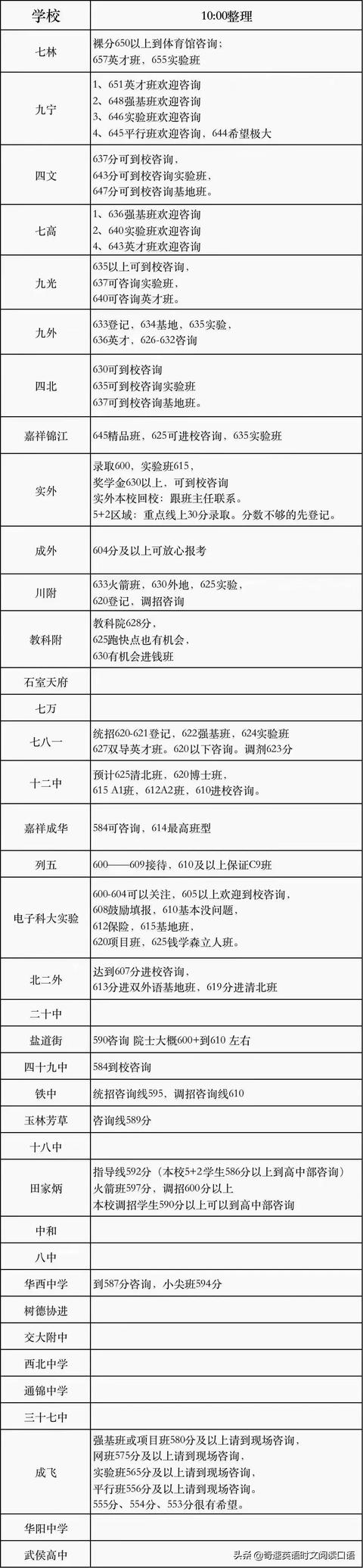 石室中学(文庙校区):基地班:647分及以上请到校咨询;实验班:643分及以上请到校咨询;平行班:637分及以上请到校咨询。