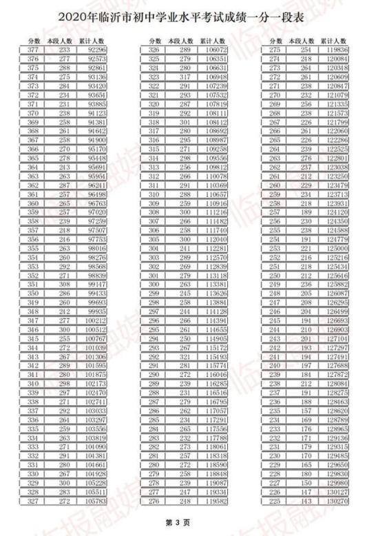 2020年临沂市初中学业水平考试成绩一分一段表(三区)