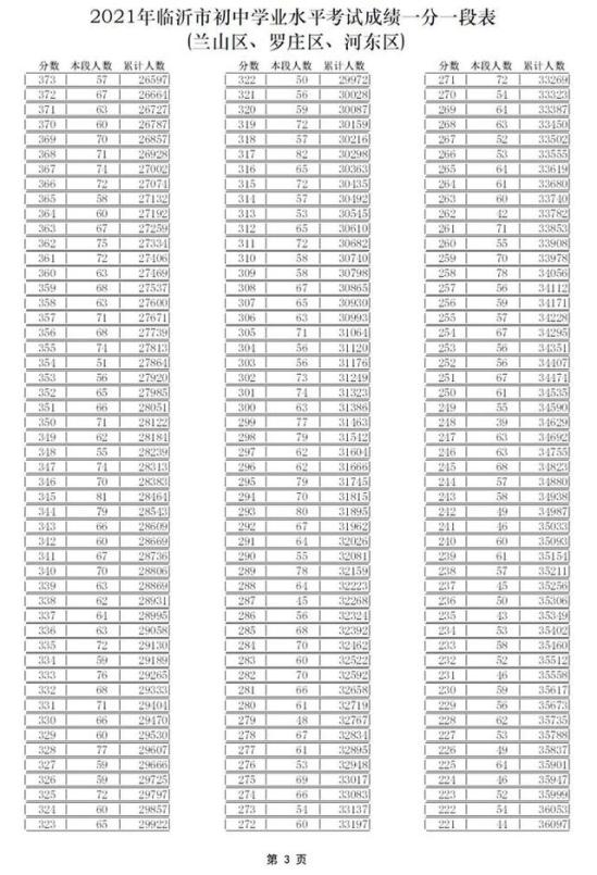 2021年临沂市初中学业水平考试成绩一分一段表(三区)