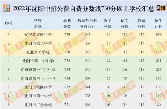 根据上图我们可以发现,统招公费最低分数线超过730分的有九所学校,且与众多家长心中的排名相差无几。前三甲依然是“沈阳三校”,第二梯队三所学校最低分数同为734分,民办高中广全学校的最低分数也比去年高了11分,着实令人吃惊。