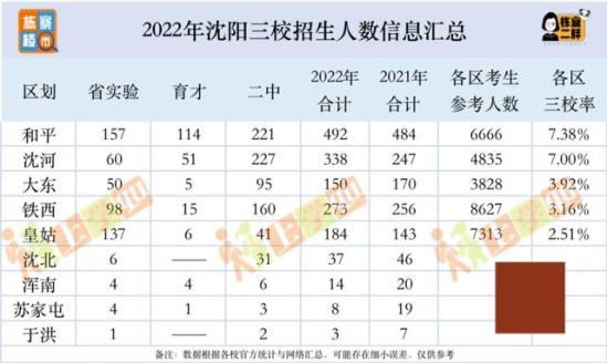根据省实验、二中、育才三校公布的数据我们也整理了关于各区的三校率,如上图。在这里我们可要重点说一下沈河区,今年可以说是进步很大,但沈河区的进步主要来自于七中。
