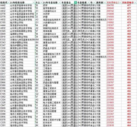 最高分为山东医药高等专科学校的药学专业,分数为477分,高出一段线33分。