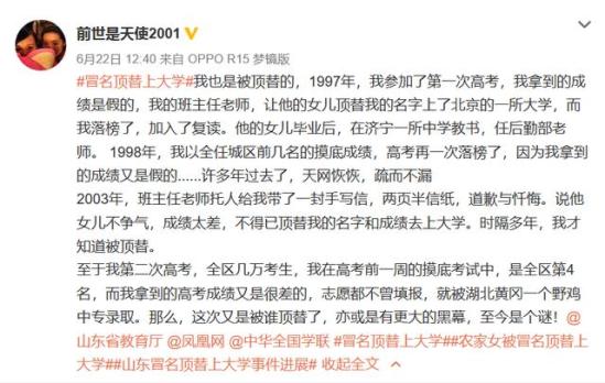 6月22日,网友苟晶(微博@前世是天使2001)发帖称, 自己曾在1997年和1998年山东高考中连续两年被冒名顶替。