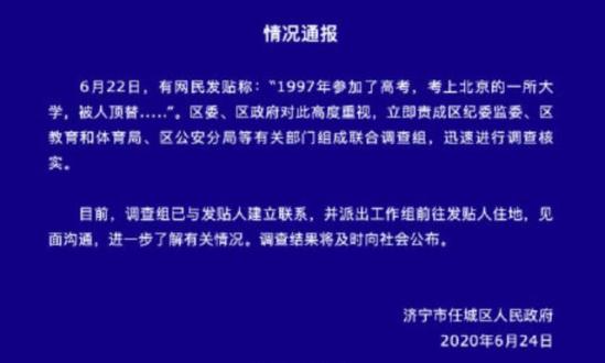 6月24日晚,山东济宁市任城区人民政府针对此事发布通报: