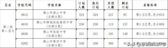 第二层次,佛山四中等4所学校指标生面向本区招生,各学校录取分数线控制在不低于该校第一批面向全市招生普通生最低录取分数线15分以内。未完成计划转入第三层次招生。