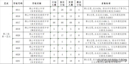 第一层次,佛山四中体育特长生最低控制分数线为文化科461分。荣山中学体育特长生最低控制分数线为文化科440分。佛山市实验中学体艺类特长生根据考生志愿按合成总分成绩由高分到低分择优录取,合成总分的构成,文化科成绩(含加分)占50%,校考术科成绩占50%,计算公式为:合成总分=文化科成绩(含加分)×50% 术科成绩×7.2(术科总分为100分,换算系数为:720/100=7.2)×50%;同时,文化科最低控制线为460分。佛山市禅城实验高中特长生根据考生志愿按合成总分成绩由高分到低分择优录取,合成总分的构成,文化科成绩(含加分)占50%,市统考术科成绩占50%,计算公式为:合成总分=文化科成绩(含加分)×50% 术科成绩×术科总分换算为720分系数(如:美术科总分为200分,则换算系数为:720/200=3.6,音乐、舞蹈术科以此类推)×50%;同时,文化科最低控制线为430分。各学校未完成计划自动收回,转为该校面向区内招生的普通生计划。