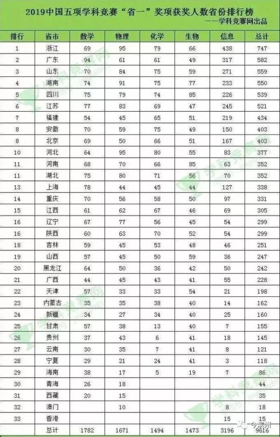 《2019全国500强中学之五大学科竞赛“省一”排行榜》