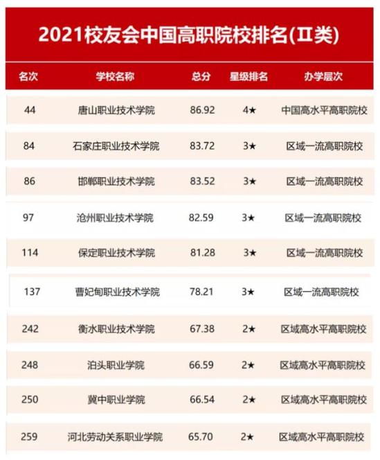 2021年校友会中国高职院校排名(Ⅱ类)中,唐山职业技术学院(44)、石家庄职业技术学院(84)、邯郸职业技术学院(86)、沧州职业技术学院(97)排名进入全国100强。