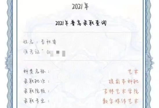 △2021届李秋睿同学被吉林艺术学院数字媒体艺术专业录取