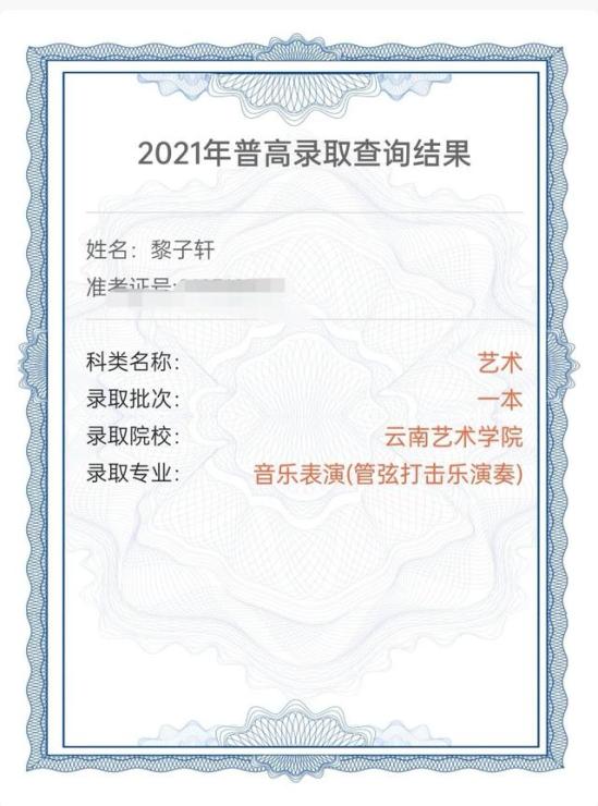 △黎子轩同学不仅以云南艺术学院小提琴表演专业校考第一名的成绩被录取,考上比利时那慕尔高等皇家音乐学院