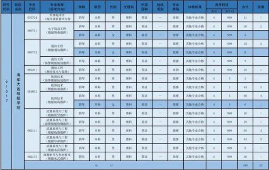 指挥类专业航海技术舰艇航海指挥体检标准:其他专业合格本专业培养水面舰艇航海初级指挥军官。主要课程:现代导航技术、地文航海、天文航海、航海气象、舰艇远海航行方法。舰艇航通指挥体检标准:其他专业合格本专业培养水面舰艇航海通信初级指挥军官。主要课程:现代导航技术、通信原理、地文航海、天文航海、舰艇通信装备。海警舰艇航通指挥体检标准:其他专业合格本专业培养海警水面舰艇航海通信初级指挥军官。主要课程:现代导航技术、通信原理、地文航海、天文航海、舰艇通信装备。通信工程舰艇通信指挥体检标准:其他专业合格本专业培养水面舰艇通信初级指挥军官。主要课程:天线与电波传播、信号与系统、舰艇通信组织与指挥、舰艇数据链通信装备及应用、海军信号通信。海警舰艇航通指挥体检标准: 其他专业合格本专业培养海警水面舰艇航海通信初级指挥军官。主要课程:天线与电波传播、信号与系统、地文航海、天文航海、舰艇通信装备。电子信息工程舰艇情电指挥体检标准:其他专业合格本专业培养水面舰艇情电初级指挥军官。主要课程:信号与系统、数字信号处理、舰载电子对抗系统作战使用、舰载指控系统作战使用、舰载雷达系统作战使用。武器系统与工程舰艇枪炮指挥体检标准:其他专业合格本专业培养水面舰艇枪炮初级指挥军官。主要课程:武器系统设计、舰炮武器构造与作用原理、武器火力控制原理、舰炮对空作战使用、中大口径舰炮火控系统。舰艇导弹指挥体检标准:其他专业合格本专业培养水面舰艇导弹初级指挥军官。主要课程:导弹武器构造与作用原理、武器系统设计、舰舰导弹火控系统、舰舰导弹战斗使用、舰空导弹战斗使用。舰艇水武指挥体检标准:其他专业合格本专业培养水面舰艇水雷与反水雷初级指挥军官。主要课程:鱼雷导航与控制技术、水下无人布雷系统及战斗使用、反水雷武器系统原理、水雷武器战斗使用、反水雷武器战斗使用。舰艇航空指挥体检标准:其他专业合格本专业培养水面舰艇航空、反潜航空初级指挥军官。主要课程:航空概论、舰载直升机战术运用、舰载直升机机载武器、直升机舰面系统、舰载直升机指挥。海警舰艇枪炮指挥体检标准:其他专业合格本专业培养海警水面舰艇枪炮初级指挥军官。主要课程:武器系统设计、舰炮武器构造与作用原理、武器火力控制原理、舰炮对空作战使用、中大口径舰炮火控系统。探测制导与控制技术舰艇水武指挥体检标准:其他专业合格本专业培养水面舰艇反潜初级指挥军官。主要课程:水下探测原理、舰载声呐系统、水面舰艇反潜作战、鱼雷武器系统、鱼雷防御武器系统。非指挥类专业测绘工程测绘技术与保障体检标准:其他专业合格本专业培养海道测量、海洋遥感、海图制图初级技术军官。主要课程:测绘学概论、海图学基础、海洋地理学、海洋测深学、海道测量。军事海洋学海洋调查技术与保障体检标准:其他专业合格本专业培养海洋调查初级指挥与技术军官。主要课程:物理海洋学、卫星海洋学、海洋调查方法、海洋调查资料处理、海洋要素分析与预报。
