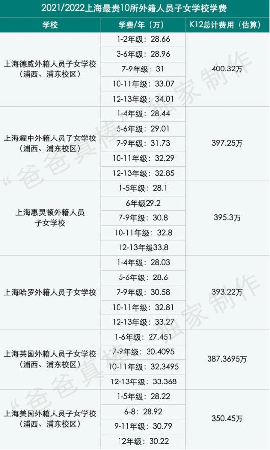 学费最贵的不出所料的都是外籍人员子女学校!其中,上海德威登上榜首,13年读下来至少400万打底。K12民办双语学校最贵的是德闳、赫德、诺德安达、包玉刚和耀华临港,12年下来,220万打底。