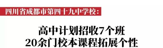 四川省成都市第四十九中学校副校长张宇介绍,今年学校高中计划招收7个班,其中调剂生43名。特色班级有“火箭班”和“创新实验班”。目前,学校有两个校区,一个是今年1月新建投入使用的枫林校区,位于圣灯路39号,设有初中部和高中部。另一个是和美校区,位于保华路68号,设有初中部。
