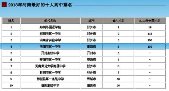 参考一个高中排行榜。在高三网2018河南省最好的十大高中排名中,南阳市第一中学排在全省第4位,仅次于郑州外国语学校,郑州一中和河南实验中学(排名仅供参考)。