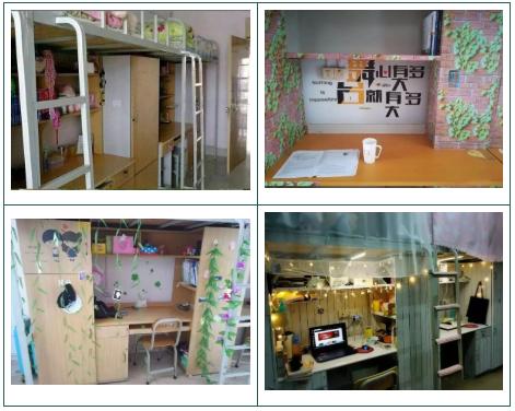 主要分为4人间和6人间,都是上床下桌,东西区全部装了空调,每个宿舍3台风扇,3~4盏电灯,有饮水机(大叔会送上门)。