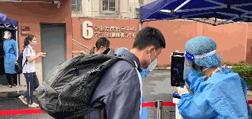 上海市格致中学学生有序入校,进入测温通道测量体温。