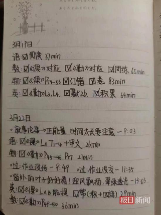 “计划很多人都会做,但能严格实施并坚持复盘并不容易。”邓洁说,他曾看过戚翰雯假期的计划表,上面每一科学什么、早上几点起床、几点休息、几点喝水,她都写得一清二楚,时间安排细化到了每一个小时。