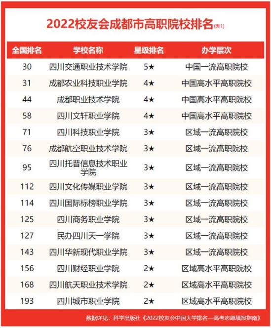 在最新校友会2022中国高职院校排名中, 四川交通职业技术学院综合实力排名最高,办学水平最高,全国排名第30名,夺得2022成都市高职院校排名榜首。成都农业科技职业学院高居全国第31名,排名第2名。成都职业技术学院排行全国第44名,位列第3名。四川文轩职业学院排名全国第58名,位居第4名。四川科技职业学院高居全国第71名,高居第5名。成都航空职业技术学院位列全国第76名,位居第6名。四川托普信息技术职业学院高居全国第95名,位居第7名。四川文化传媒职业学院排行全国第112名,名列第8名。四川国际标榜职业学院高居全国第114名,位居第9名。四川商务职业学院名列全国第125名,位居第10名。