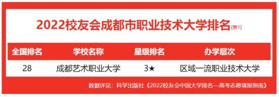 在最新校友会2022中国职业技术大学排名中, 成都艺术职业大学办学实力最强,最具竞争力,办学水平最高,全国排名第28名,位居2022成都市职业技术大学排名首位。