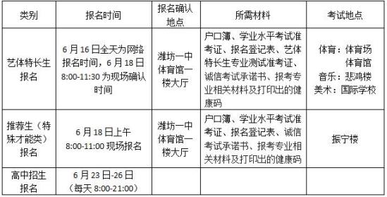 1.艺体特长生专业测试报名: 6月16日全天为网络报名时间,考生登录潍坊一中网站(www.wffms.com)进行网上报名,上传一寸彩色免冠照片,准考证自动生成后可打印,附件中各专业报名登记表等相关材料自行下载并打印,网报产生的报名号即为专业测试编号;6月18日8:00-11:30,考生本人持户口簿、学业水平考试准考证、艺体特长生专业测试准考证、报名登记表及报考专业的相关材料到潍坊一中体育馆一楼大厅进行现场确认。(美术专业考生需要提供市级以上医院出具的无色盲、色弱的诊断证明;体育专业考生需要提供学生意外伤害保险单、身体健康体检证明;体育专业中篮球、足球和游泳项目的报名条件及需要提供的材料详见《潍坊一中2020年艺体特长生招生及录取实施方案》)