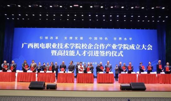 广西新闻网南宁1月15日讯(记者 谢琳琳 通讯员 马虹)1月14日,广西机电职业技术学院成立智能制造、智能控制、汽车、人工智能、智慧物流、智慧建筑、乡村振兴、文化与旅游、创新创业等9个特色产业学院,并引进“全国技术能手”“全国五一劳动奖章获得者”“国家级技能大师工作室带头人”为代表的217名高技能人才。据了解,该校此次新成立的9个特色产业学院,是与华为、吉利汽车、柳工、玉柴等一批世界500强、世界工程机械50强行业龙头和领军企业“强强联姻”共建的,采用协同育人的办学模式,协调推进学院新工科、新商科、新文科等多学科、多专业交叉融合发展的创新型人才培养模式新格局,培养与广西产业链需求的紧密对接的人才。