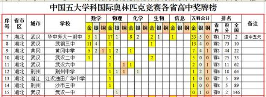 - 1、榜首之争。10月12日文章我将华中师大一附中列第一,那是因为我已经收集齐了五大学科全部的获奖人员名单,根据手头的资料显示,华中师大一附中是33金,而湖南师大附中是32金,因此按照我们金牌优先的传统,将华中师大一附中排第一位。后来有好多网友向我反映,湖南师大附中的金牌数是34金。于是我开始仔细核查,发现34金属实,有一块是地理的,不属于五大学科的范围,不计入五大学科排行。另有一枚是2001年的生物,廖雅静同学是湖南师大附中的,但是百度里面几乎所有资料都计入了长沙一中,因此湖南师大附中少算了一枚金牌,而长沙一中多算了一枚。因此,湖南师大附中和华中师大一附中都是33枚金牌,银牌湖南师大附中多,湖南师大附中排第一!