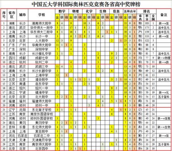 一、整体情况如何判断一个省高中的实力高低,仁者见仁智者见智,我个人认为可以从四个“度”来判断,一个是幅度,一个是锐度,一个是精度,还有一个是厚度。幅度是指该省有某个或者某几个学校五科全部夺牌或者夺金,没有跛腿,均衡性强,4科夺金 1科夺牌的我称之为五子登科,全部夺金我称之为连中五元。锐度是指该省有某个或者某几个高中争金夺银的实力超群,金牌总数较多,具有呼之即来、来之即战、战则必胜的实力,万军丛中取敌上将首级,犹如探囊取物耳。精度是指该省有某个或者某几个高中专门集中于某一科或者两科,在这一两科里面成绩相当突出。厚度则是指该省夺牌和夺金的学校众多,面很广,而不是集中在那么少数几个学校里面。