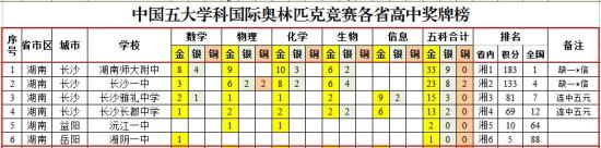 金牌有变动:湖南师大附中33、长沙一中23、人大附中23、北大附中9