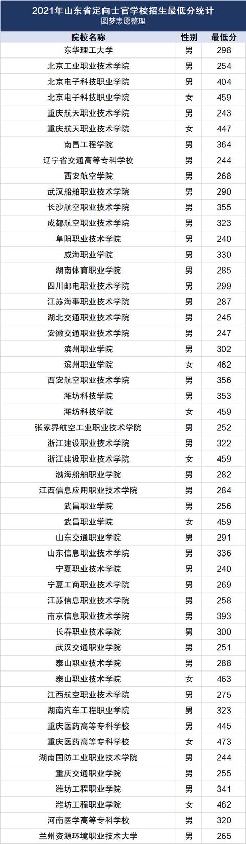 三. 2021年所有在山东招定向士官的学校名单及最低分数