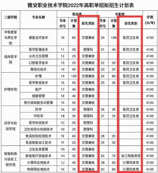 雅安职业技术学院2022招生计划表中明确注明了专业招生类别,因此在填报专业志愿时,尤其是中职类考生须按高考报名时确定的专业类别填报符合学校招生类别条件的高职单招专业志愿。