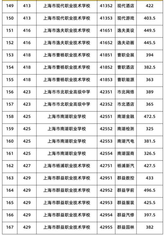 其中,上海电力工业学校的电力动能、电力电气以及上海健康医学院附属卫生学校的健康护2专业,分别以542分、541分、535分,列前三位,分别高出中本贯通最低投档控分线92分、91分和85分。