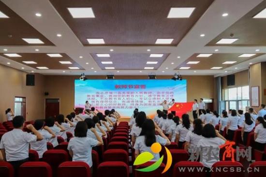 9月8日下午,全校教师齐聚学术报告厅举行了庄严的宣誓活动。老师们面对国旗,紧握右拳,庄严宣誓。誓言有声,育人无形,每位老师将带着“一诺千金”的忠诚,恪守为师之本,怀揣教育梦想,不忘初心,砥砺奋进。