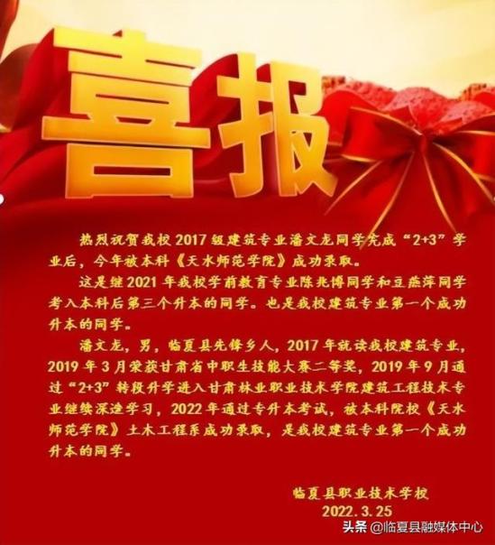 一是我校390名同学通过“2 3”转段考试等升入高职院校,实现了大学梦(其中今年参加转段学生169名);初中毕业后用五年时间完成大学学业,比普通高中提前一年实现大学梦,节省了一年宝贵的青春年华;二是升入高职院校的陈兆博、豆艳萍、潘文龙等六名同学通过专升本进入本科院校继续学习(2021年学前教育专业学生陈兆博考入甘肃民族师范学院,豆艳萍考入兰州文理学院;2022年建筑专业学生潘文龙考入天水师范学院)。