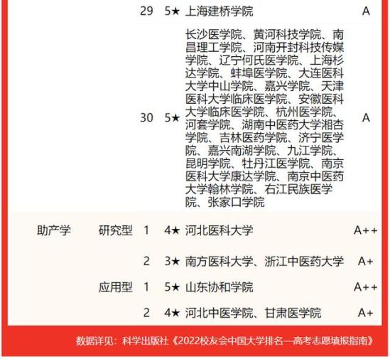 榜单显示, 在“助产学专业排名(研究型)”中,河北医科大学荣得中国四星级专业(4★),挺进世界知名、中国高水平专业行列,雄居校友会2022中国大学助产学专业排名(研究型)冠军。