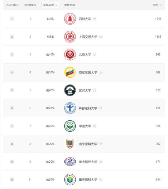 中国最好学科(口腔医学)排名:排名前十的大学依次是四川大学、上海交通大学、北京大学、空军军医大学、武汉大学、首都医科大学、中山大学、南京医科大学、华中科技大学、重庆医科大学。其中重庆医科大学由2020年的第十一名上升1名变为第十名,而原来第十名的同济大学则下降了一名,变为第十一名。