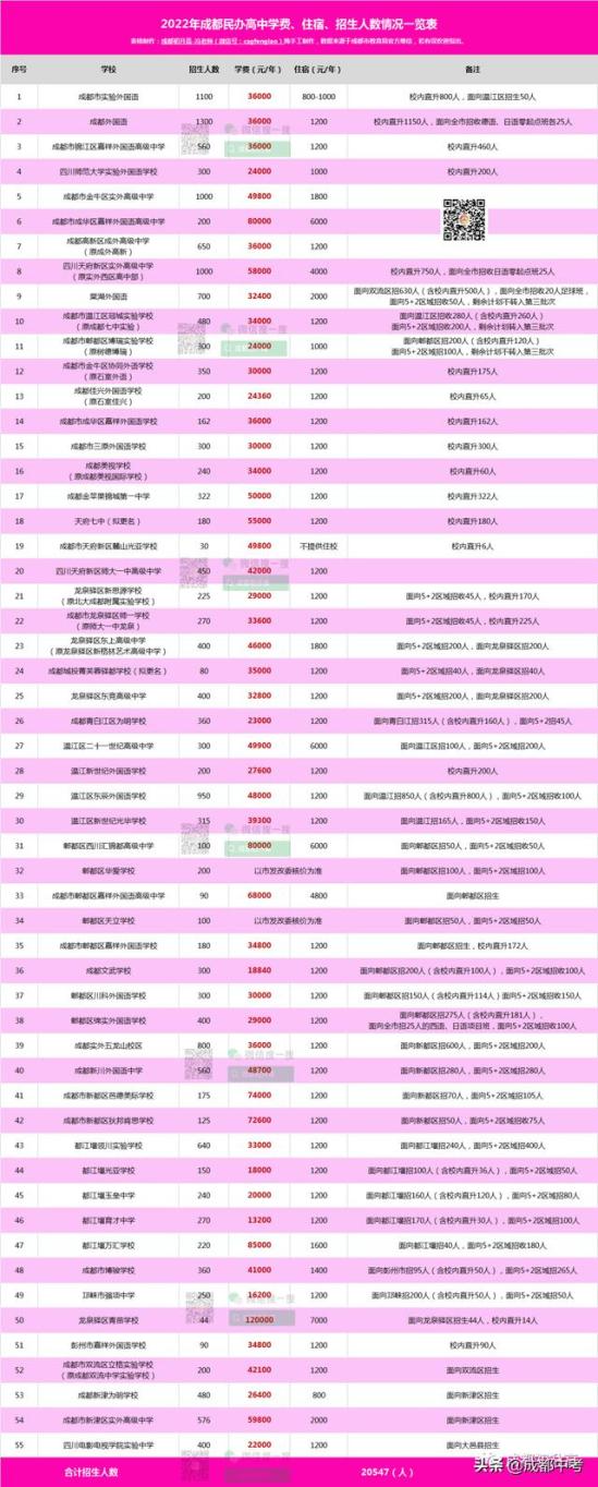 今天,应家长同学的要求,今天冯老师将2022年成都全部民办高中的具体信息整理如下(含高一学位计划、本校直升人数、学费、住宿费、招生范围)!供各位学生家长择校参考收藏。