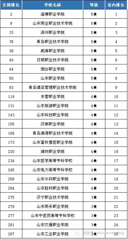 山东省的高职院校实力非凡,淄博职业学院排名全国第二。全国前50的高职院校中有8所是山东的5星等级院校。排名全国高职前300的山东有25所。下图为山东省高职25强排行。