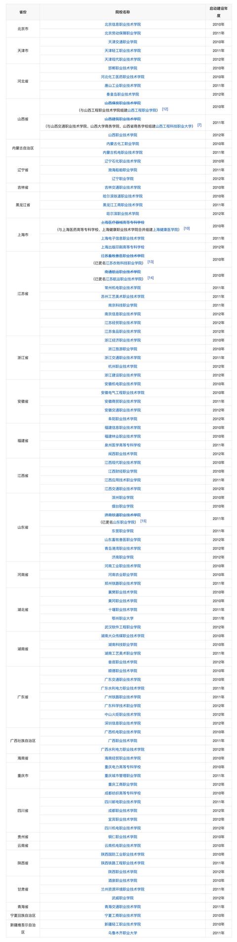 为了提升高等职业院校的办学水平,2006年,教育部和财政部正式启动了“国家示范性高等职业院校建设计划”的工程。首批立项建设有28所院校,第二批建设的有42所院校,第三批建设30所院校,共100所。这些示范性高职院校又被称为 “高职的211”院校,是一个省高职院校的典范,也基本上是一个省的最强专科院校,国家示范性高职院校具体名单如下: