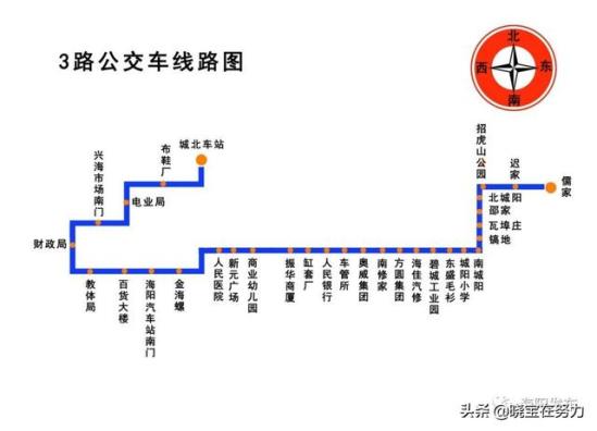3路站点:城北车站(首班车6:30,末班车17:00,每60分钟一班车)-布鞋厂-电业局-兴海市场南门-财政局-教体局-百货大楼-海阳汽车站南门-金海螺-人民医院-新元广场-商业幼儿园-振华商厦-缸套厂-人民银行-车管所-奥威集团-南修家-方圆集团-海佳汽修-碧城工业园-东盛毛衫-城阳小学-南城阳-镐地-瓦埠庄-邵家-北城阳-招虎山公园-迟家-儒家(首班车6:40,末班车17:00,每60分钟一班车)