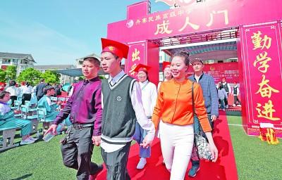 在贵州省黔东南苗族侗族自治州丹寨县举行的学生成人礼上,年满十八岁的高中生与家长走过“成人门”。新华社发
