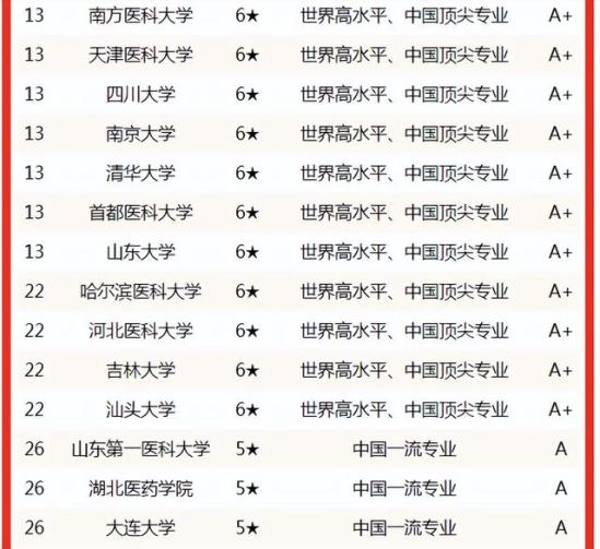 在最新校友会2022中国大学临床医学专业排名(研究型)中,北京协和医学院、北京大学荣得2022中国八星级专业(8★),跻身世界一流专业、中国最顶尖专业行列。中山大学、上海交通大学、复旦大学、浙江大学、华中科技大学、广州医科大学、陆军军医大学、空军军医大学、海军军医大学、武汉大学荣获2022中国七星级专业(7★),入围世界知名高水平专业、中国顶尖专业行列。首都医科大学、南京大学、山西医科大学、山东大学、清华大学、中南大学、天津医科大学、四川大学、南方医科大学、河北医科大学、哈尔滨医科大学、汕头大学、吉林大学荣获2022中国六星级专业(6★),入选世界高水平专业、中国顶尖专业行列。扬州大学、南京医科大学、广西医科大学、西安交通大学、山东第一医科大学、湖北医药学院、温州医科大学、中国医科大学、安徽医科大学、深圳大学、大连大学、大连医科大学、武汉科技大学、南华大学、暨南大学、西南医科大学荣得2022中国五星级专业(5★),入选世界知名专业、中国一流专业行列。